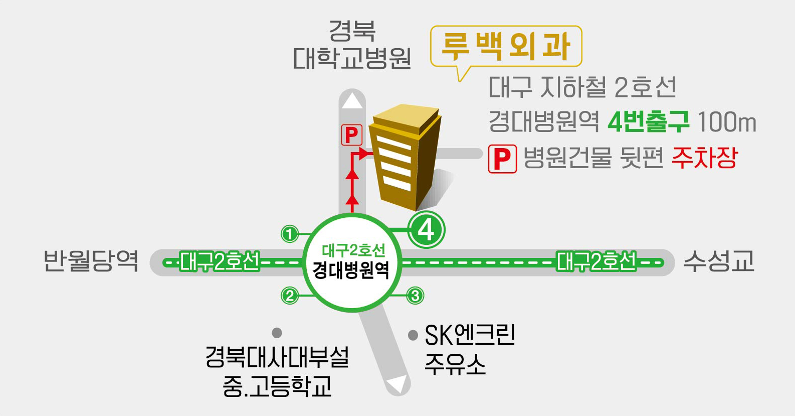 | 대중교통 | 2호선 경대병원역에서 하차 후 4번출구로 나오셔서 경대병원 방면으로 100m | |